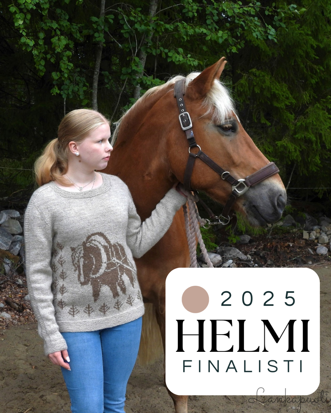 Neuleen etukappaleelle neulotaan läsipäinen suomenhevonen luokkivaljaissaan, takakappaleella toistuvat rytmikkäät havukuviot. Langaksi valikoitui värjäämätön suomenlampaan villa lähikehräämöstäni.