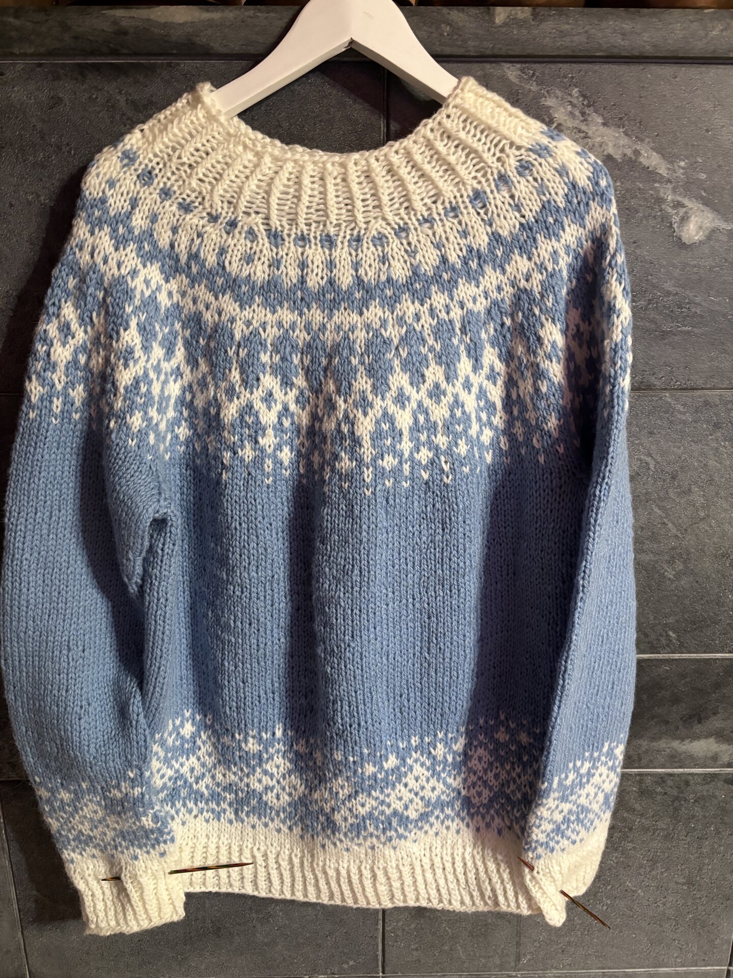 Hyvä neuloa, yhdessä kerässä paljon solmuja, hieman karhean tuntuista lankaa.