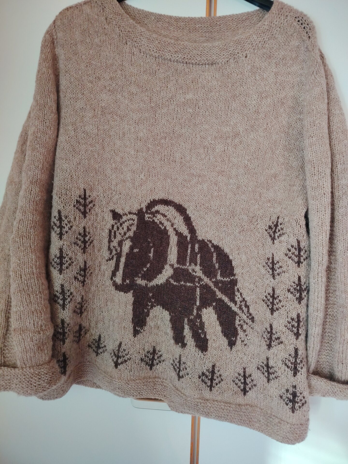 Neuleen etukappaleelle neulotaan läsipäinen suomenhevonen luokkivaljaissaan, takakappaleella toistuvat rytmikkäät havukuviot. Langaksi valikoitui värjäämätön suomenlampaan villa lähikehräämöstäni.