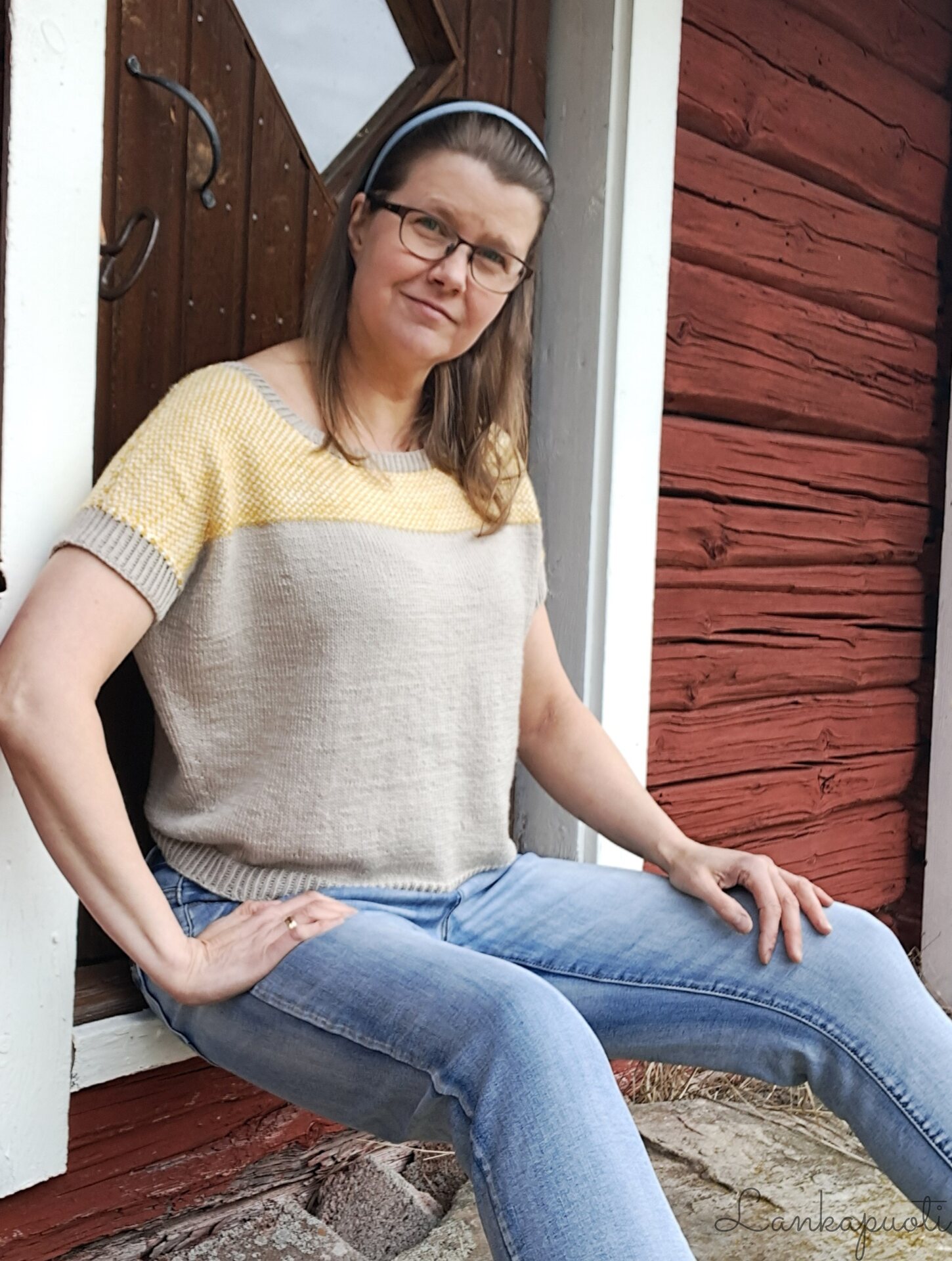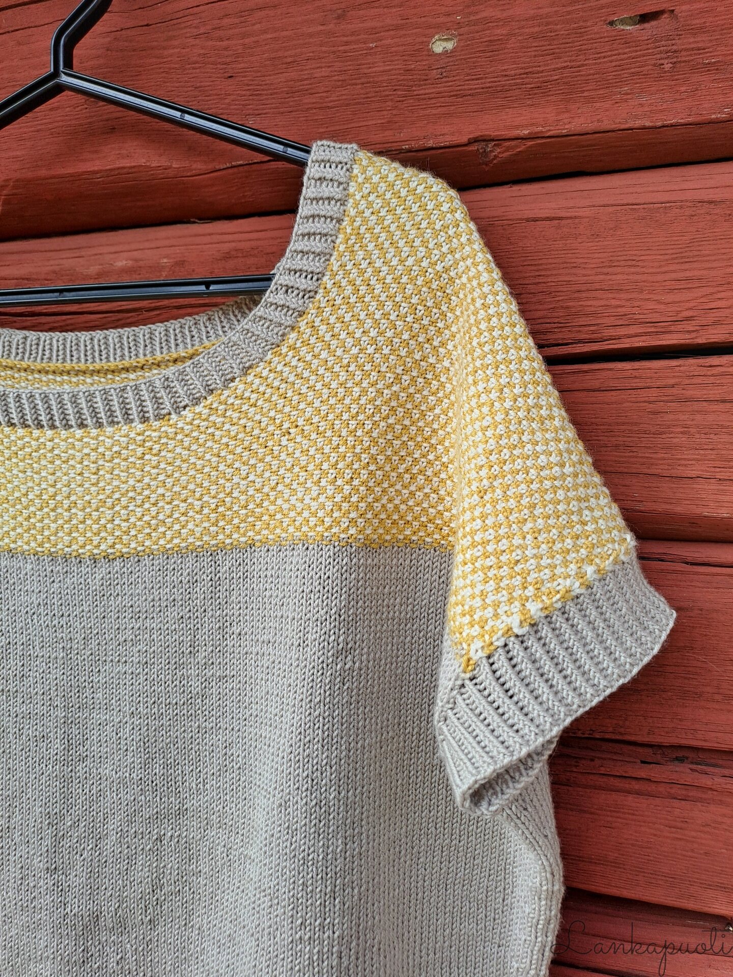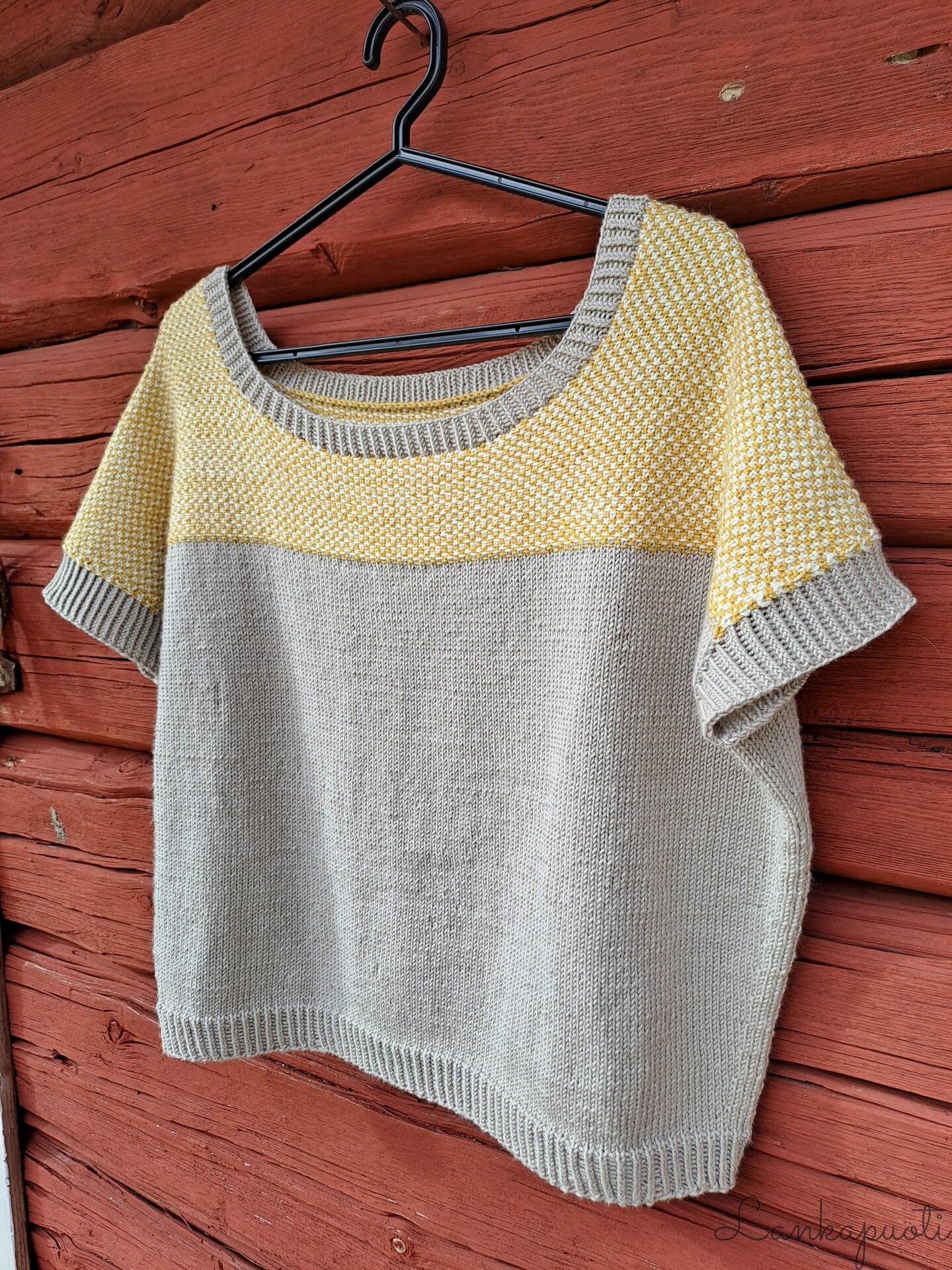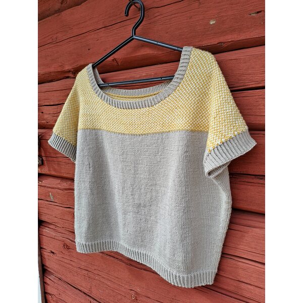 Merino-silkistä neulottu lyhythihainen pusero on miellyttävä suoraan ihoa vasten ja malliltaan rennon väljä. Alaosa on sileää neuletta, yläosassa käytetty linen stitch -neule muistuttaa kudottua kangasta. Se neuloutuu helposti yhdellä värillä kerrallaan silmukoita vuoron perään neulomalla ja nostamalla. Halusin paidan nimeksi jotain kudontaan viittaavaa yläosan mallineuleen vuoksi, ja niinpä siitä tuli Tiuhta.